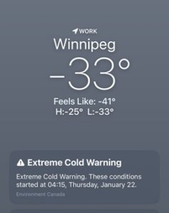 2026年2月3日(火)のカナダ・マニトバ州ウィニペグはとても寒く、最低気温はマイナス25度でした。